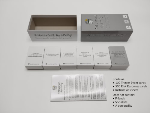 Actuarial Anarchy is fill-in-the-blank* card game for actuaries, underwriters, risk managers and all those daft brave enough to work in finance, pensions, or insurance.